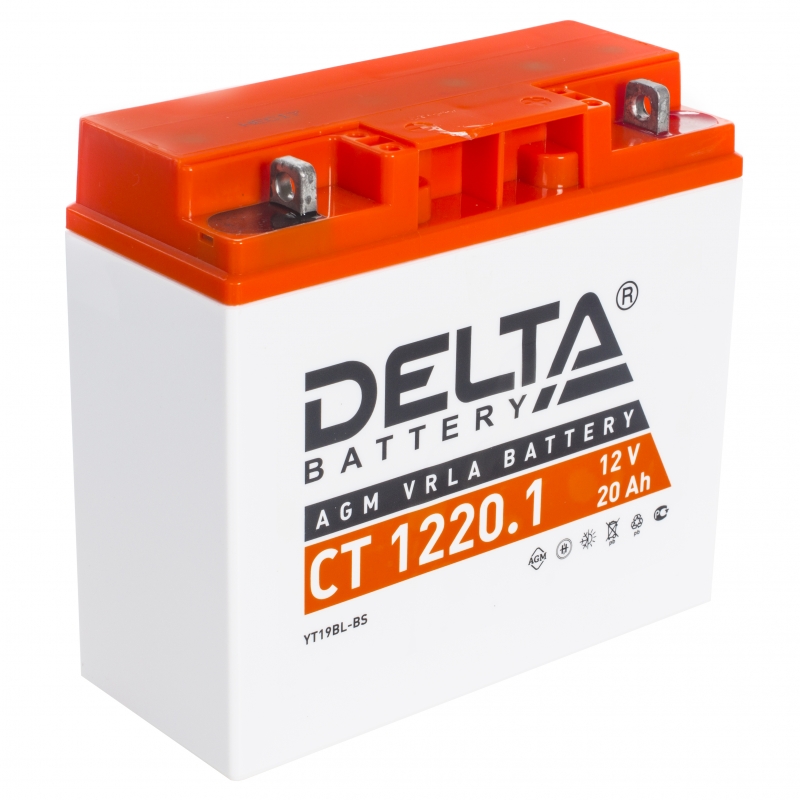 Аккумуляторная батарея для мотоцикла CT 1220.1. Емкость: 20 Ач. Пусковой ток: 20А. Полярность: обратная. Размеры: 181x77x167 мм. Производитель: Delta.